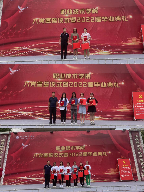 为加强党员的党性教育,强化政治责任担当,增强新党员入党的仪式感和使命感,同时为欢送2022届毕业生,师生济济一堂,为预备党员开启政治生命新篇章、为毕业生踏上人生新征程,蓄能助力,送上祝福,职业技术学院于6月20日晚在秦都校区小广场隆重举行入党宣誓仪式暨2022届毕业典礼。秦都区马泉街道纪工委书记杨伟、马泉街道纪检办主任尹俊新、马泉街道茂东社区第一书记郝治社、职业技术学院党政领导、全体师生参加了大会。